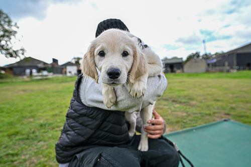 We begin training all dogs at our training field, as this is a secure environment that we can control. However, as dogs live in the real world, we quickly move training to different environments such as parks, towns and cafes to expose them to all the sights, sounds and smells they will experience once home.